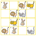 4 lü karelerden oluşan 4 kutuda boş olan yerlere resimleri yerleştirmeleri gerekiyor. Tabii her sırada aynı resimden bir tane olması şartıyla...